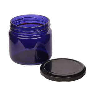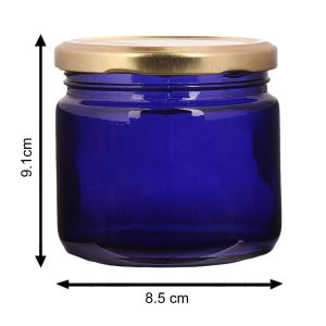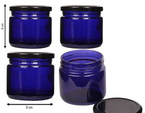 Set Of 4 Glass Jar Container Round Shape As In Picture , Size Is – 3 Inch Height And 3 Inch Dia Approx ,Which Can Contain About 150 Gms . This Jar Is Coming With A Good Quality Blue Color Metal Cap Which Is Air Tight And Special Coating Has Been Done Inside Of Cap To Avoid Any Type Of Problem In The Item You Store In The Same , It’s Completely Rust Proof And Safe To Store You Food Items .