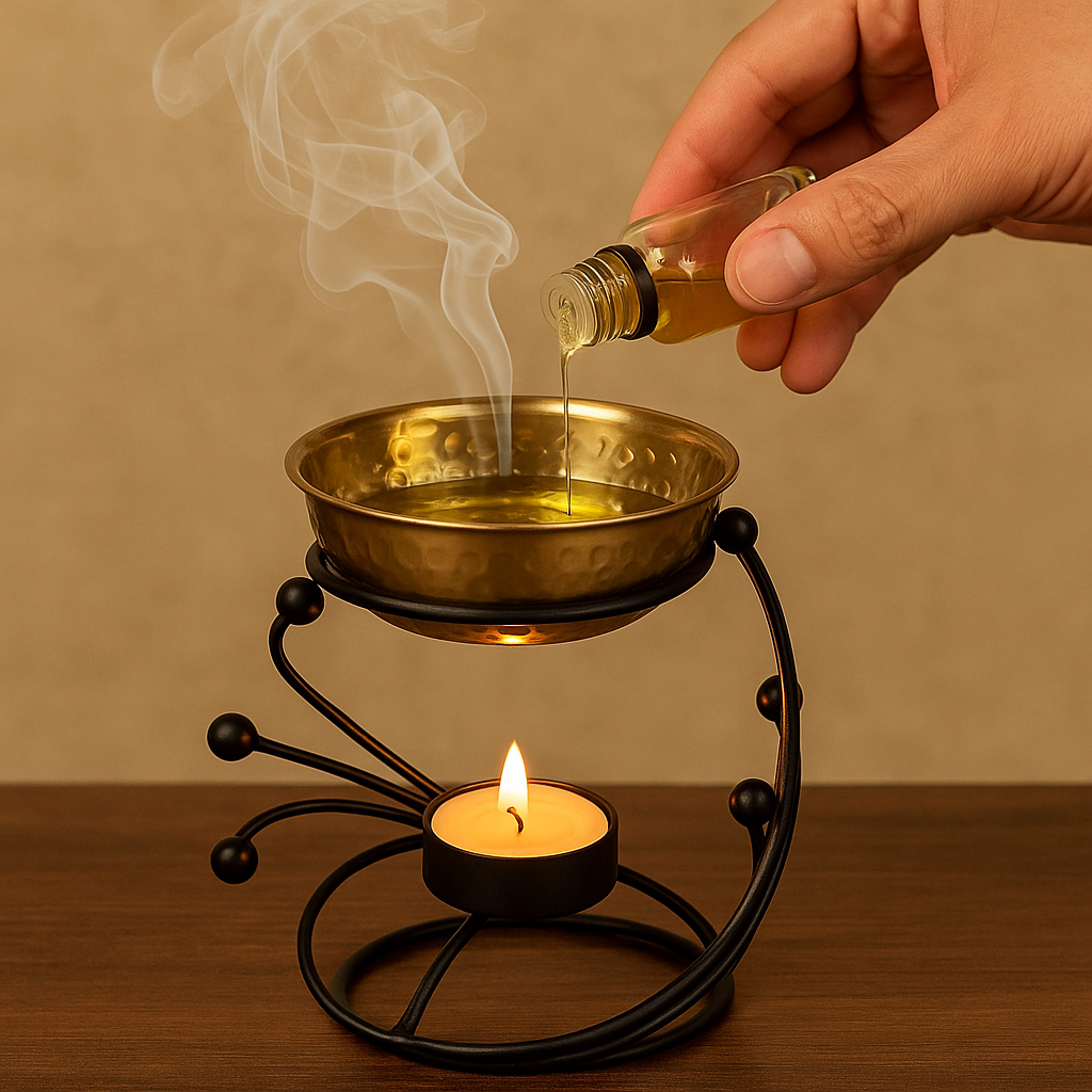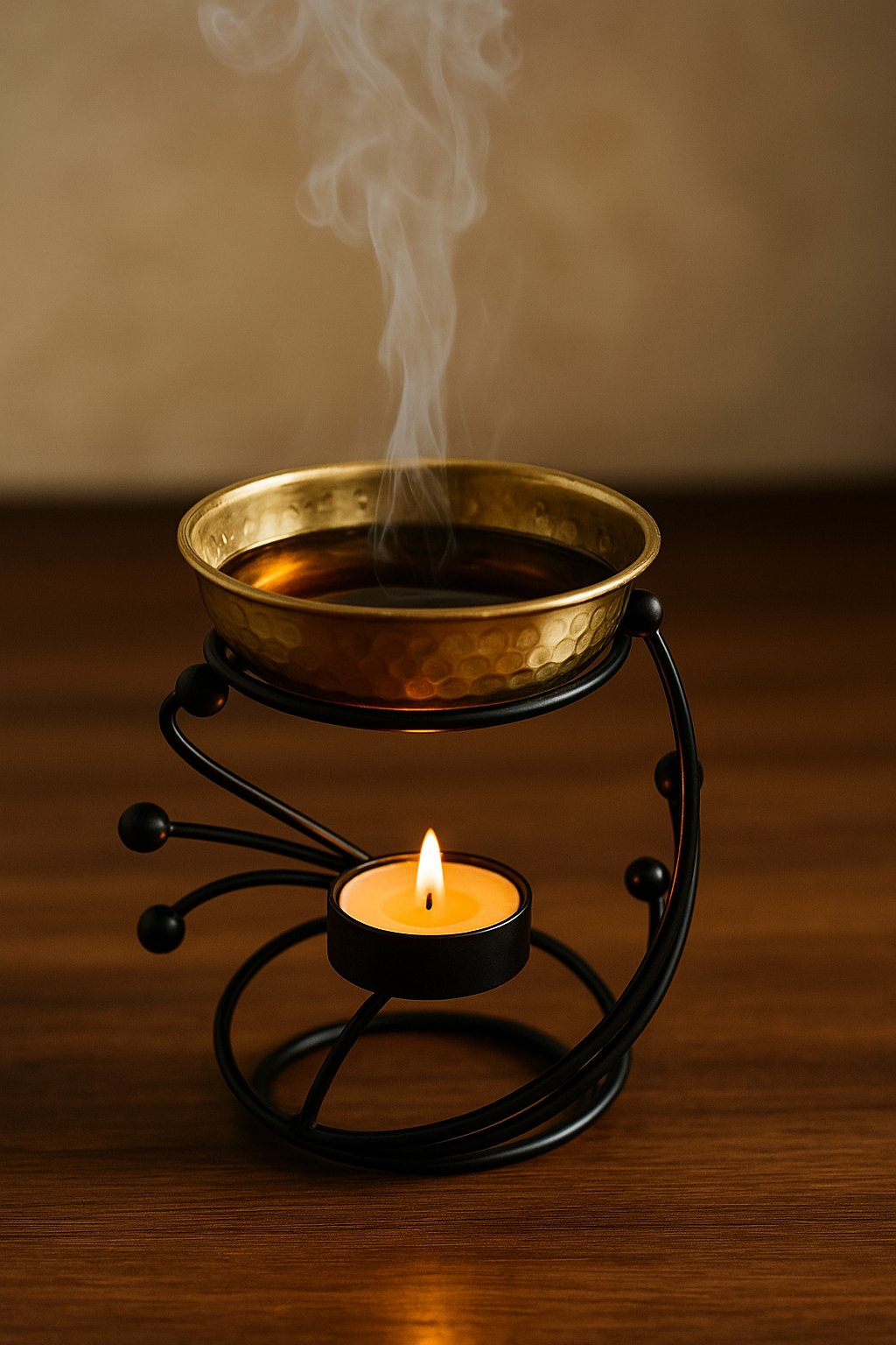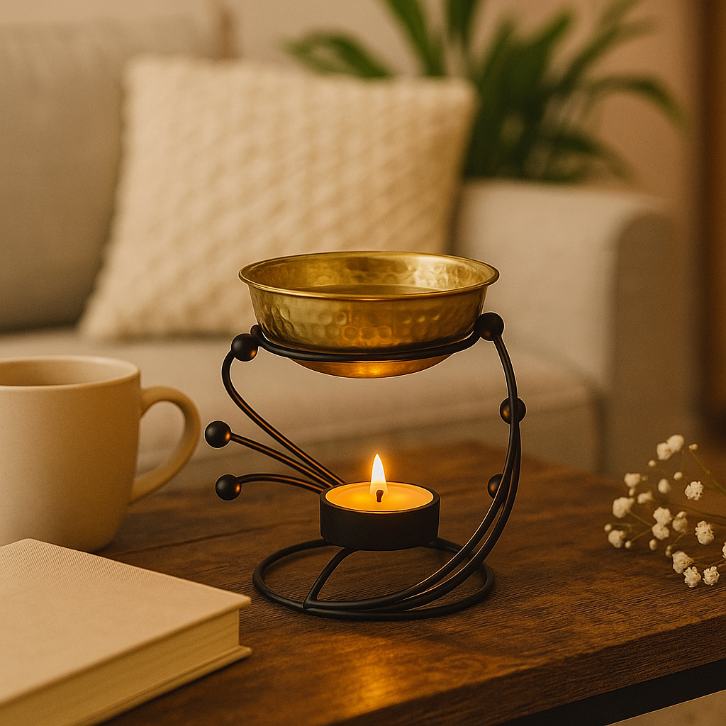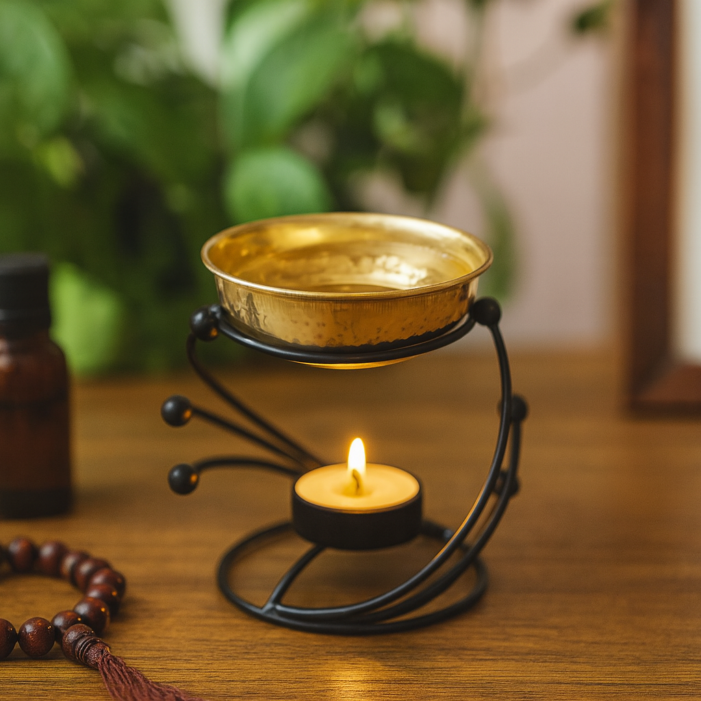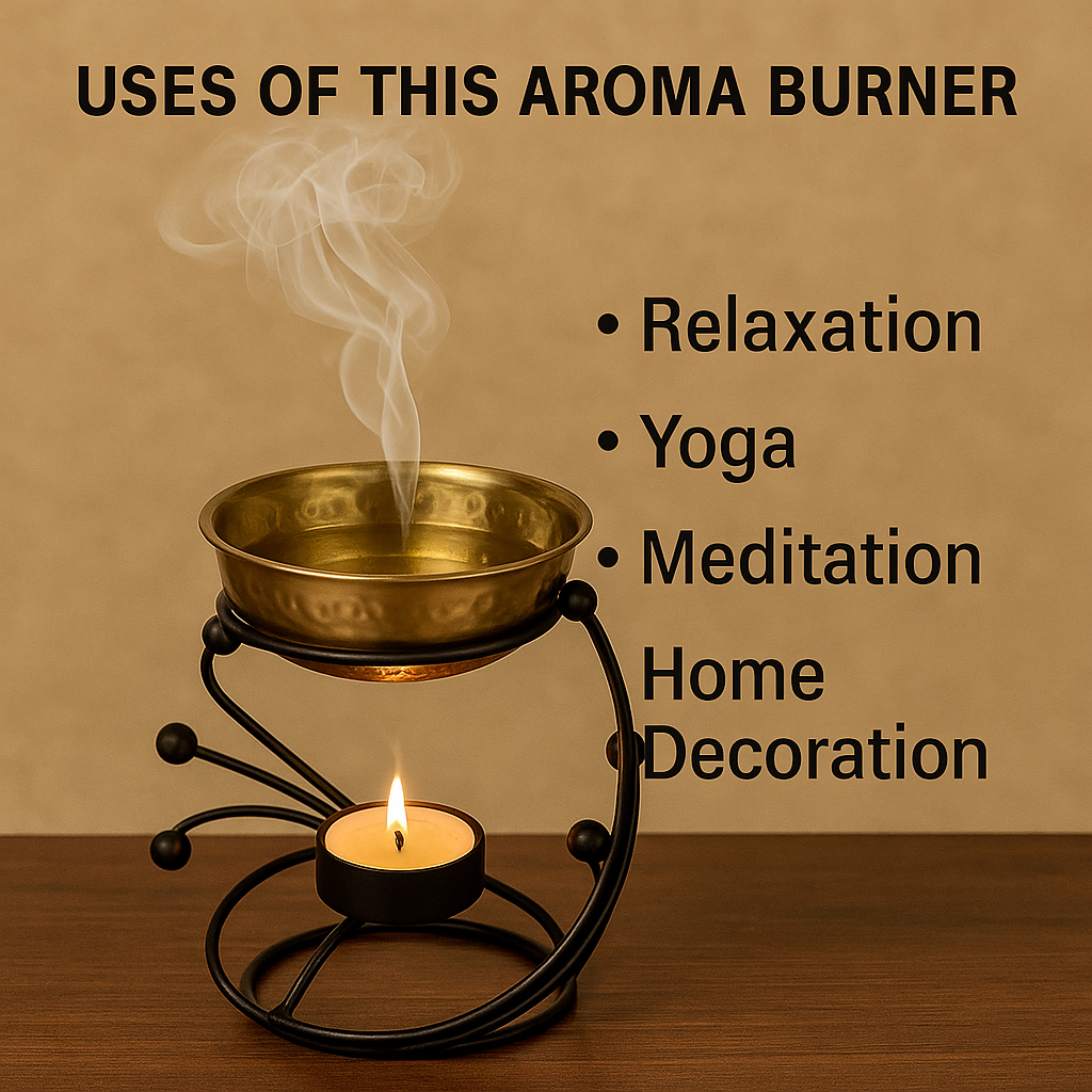 An essential contraption for aroma therapy, the oil diff-users are finding wide scale use. This interlaced metal base with pure brass hammered bowl diffuser has ample pores for even distribution of the perfumed oil. This aroma burner is suitable to use in your home , Spa, office, etc…….
