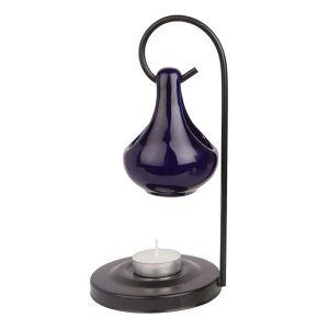 Good quality of hanging type aroma burner . containing :- 1. Dark Blue Color ceramic bowl . 2. One best quality powder coated metal stand to hang this beautiful ceramic bowl . 3. 10 ML Relaxing aroma oil . 4. 4 Pcs Tea Light Candles .