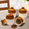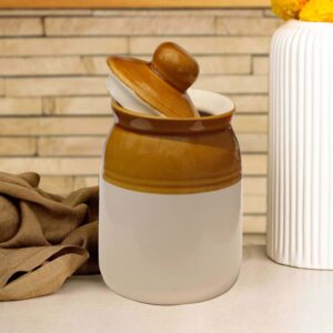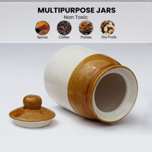 Bring home a piece of tradition with this Ceramic Ivory & Brown Pickle Jar (450ml), perfect for storing your favorite Indian pickles, masalas, or kitchen essentials. Designed with both functionality and charm in mind, this handcrafted barni is made from high-quality ceramic and finished with a non-toxic glaze to keep your food safe and fresh. The 450ml capacity makes it ideal for small households or serving a variety of condiments. Whether you’re organizing your spice shelf or adding a rustic touch to your table, this ceramic jar blends utility with timeless elegance.