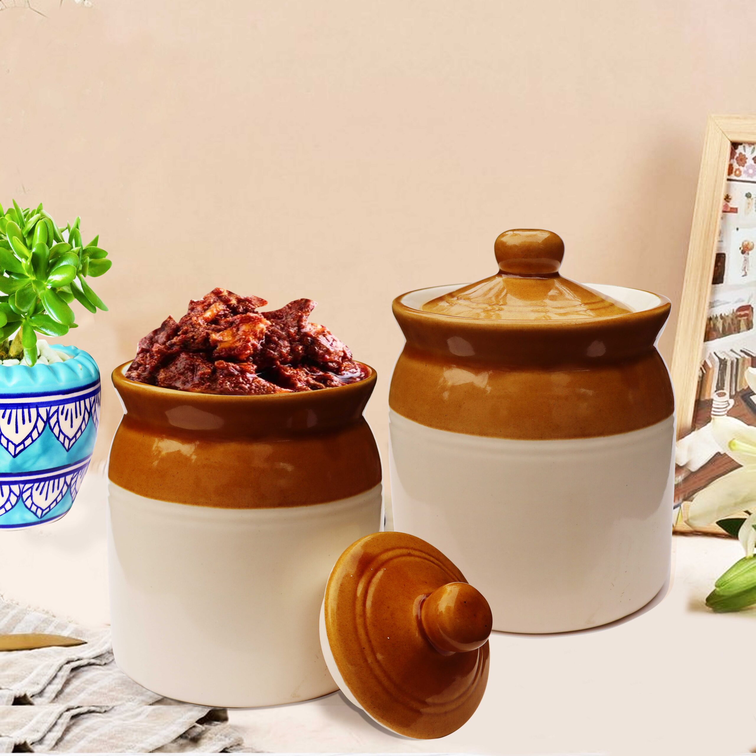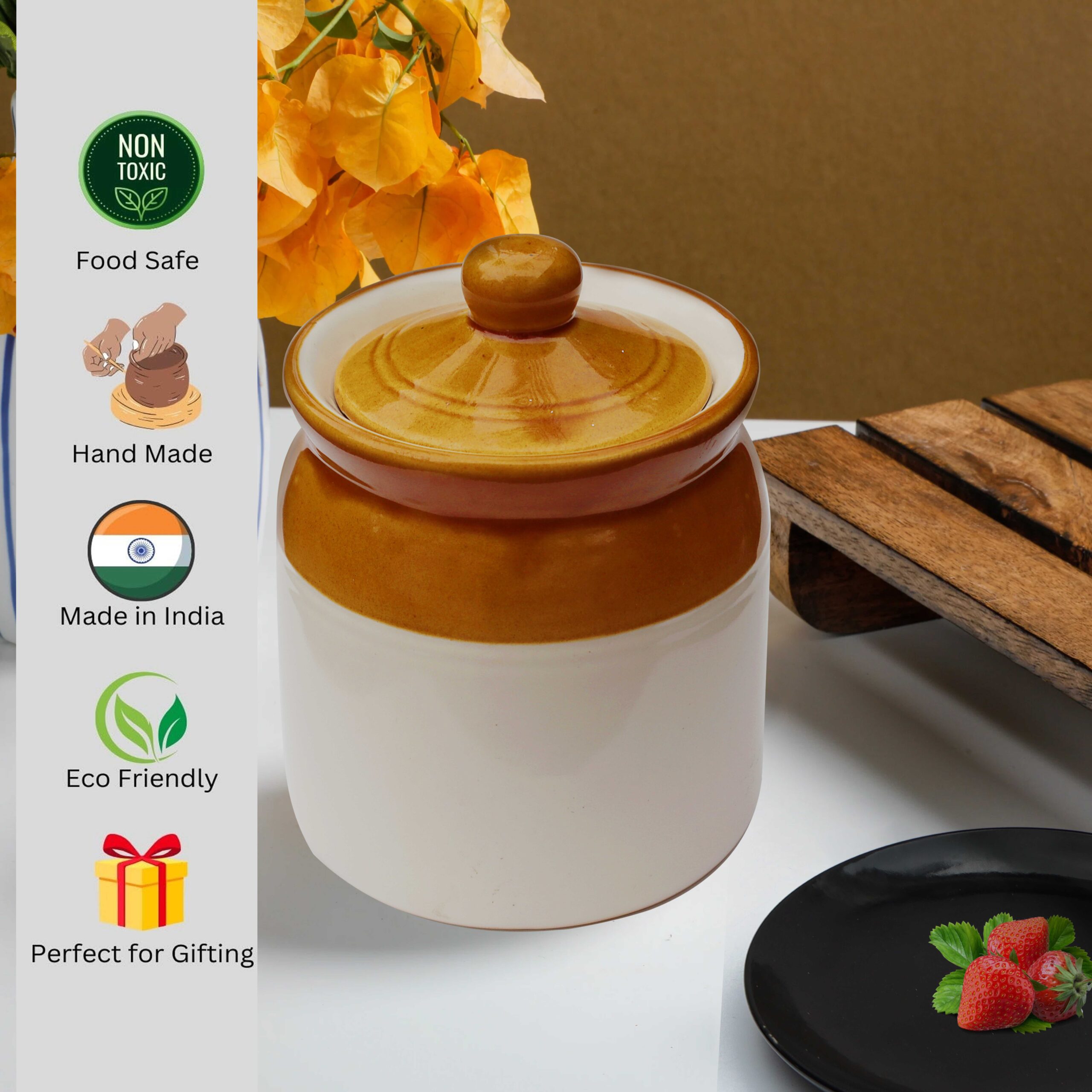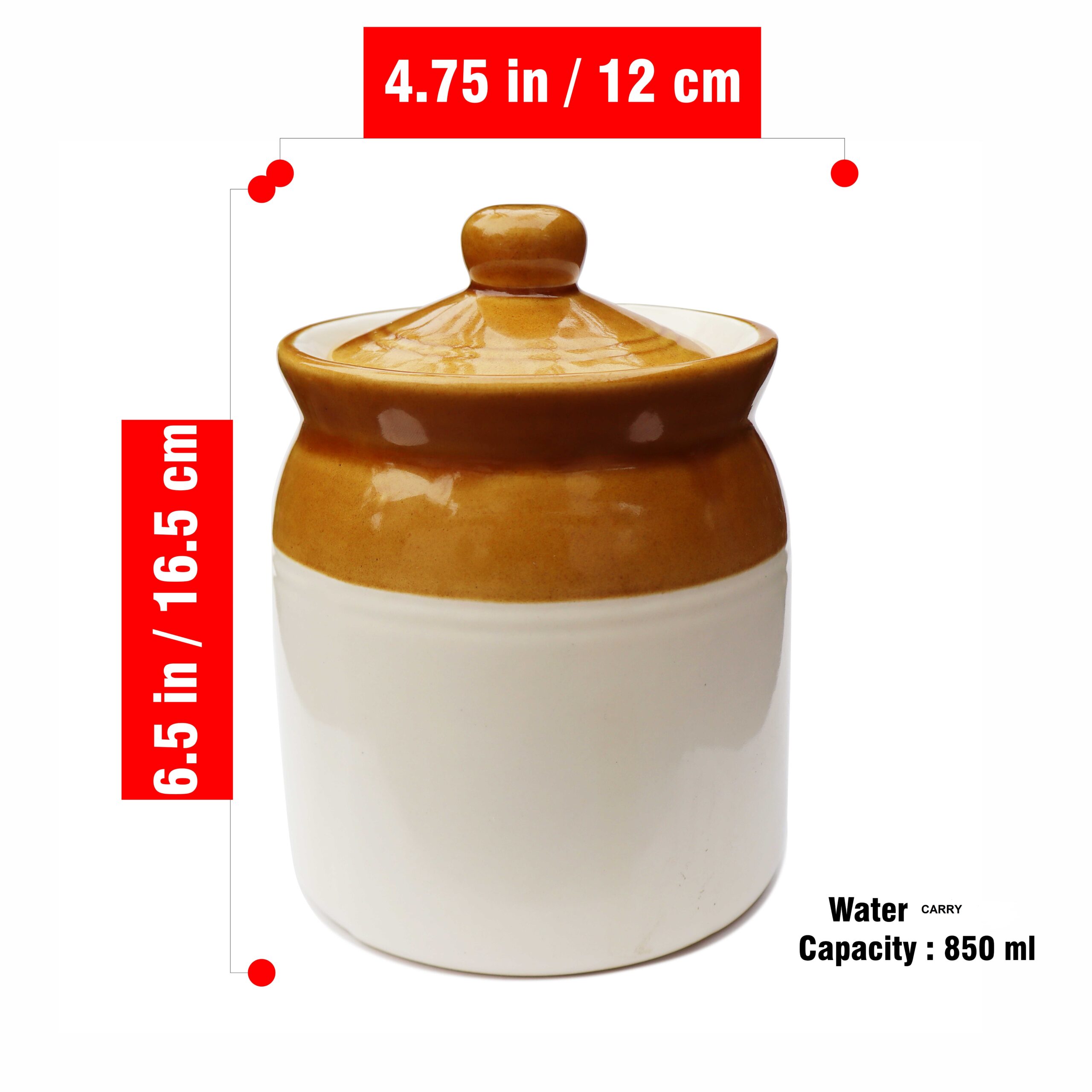 Bring home a piece of tradition with this Ceramic Ivory & Brown Pickle Jar (850ml), perfect for storing your favorite Indian pickles, masalas, or kitchen essentials. Designed with both functionality and charm in mind, this handcrafted barni is made from high-quality ceramic and finished with a non-toxic glaze to keep your food safe and fresh. The 850ml capacity makes it ideal for small households or serving a variety of condiments. Whether you’re organizing your spice shelf or adding a rustic touch to your table, this ceramic jar blends utility with timeless elegance.