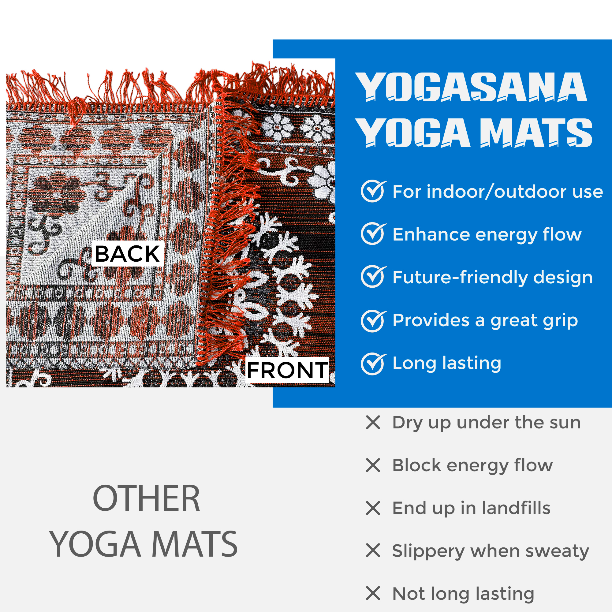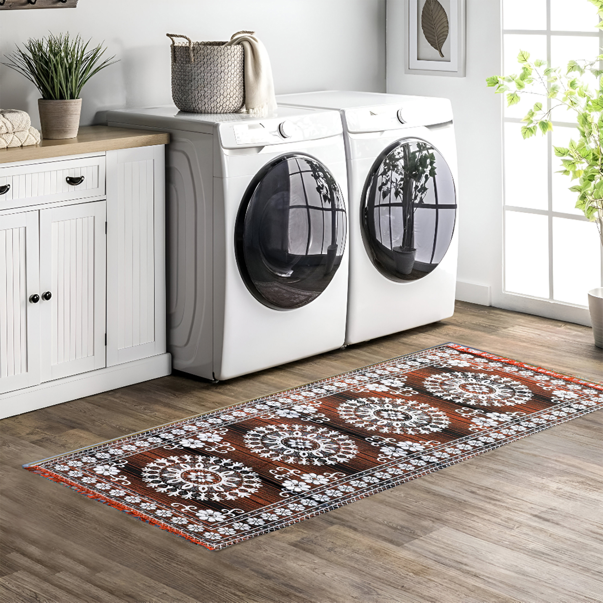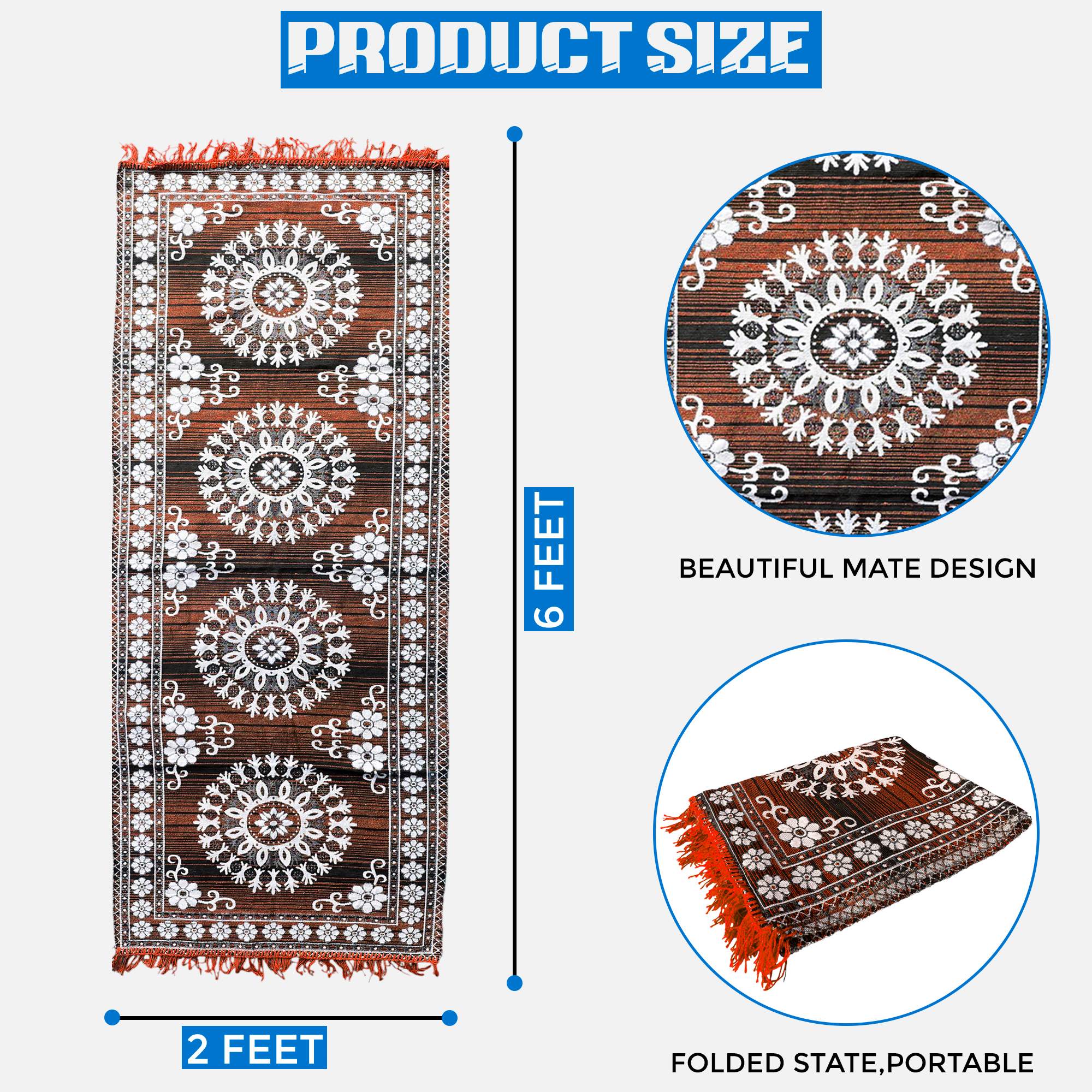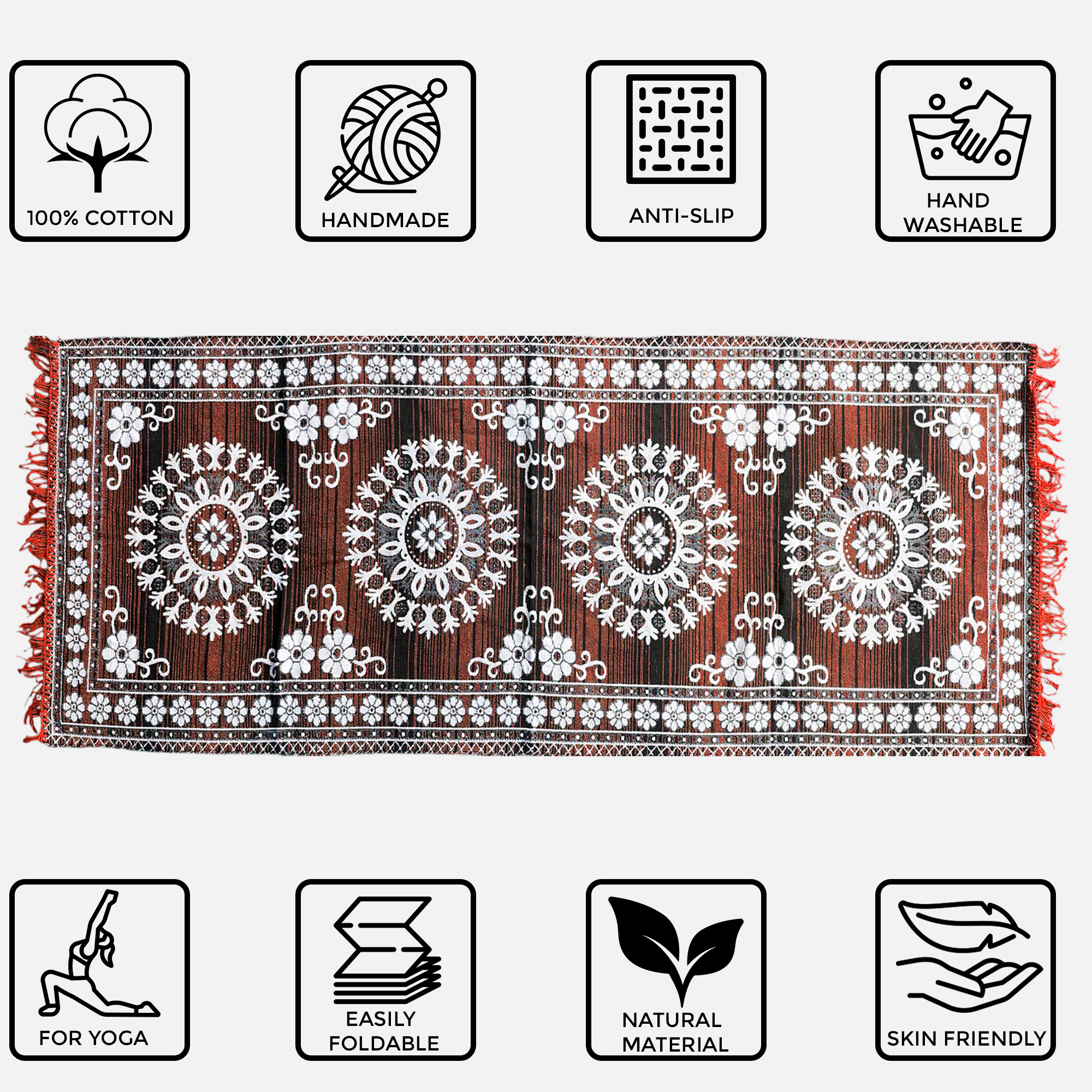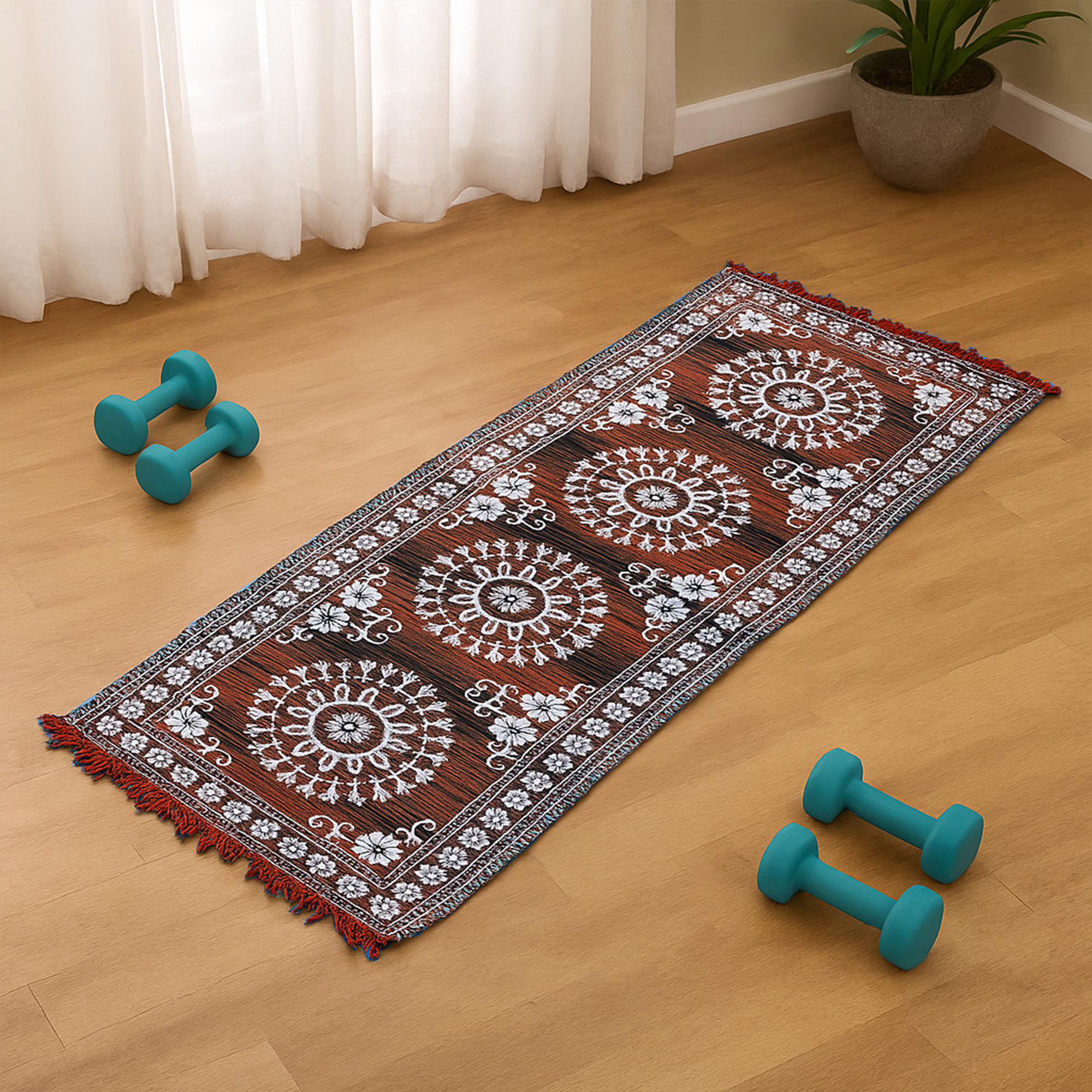 Add a touch of elegance and tradition to your space with this handwoven blue floor mat featuring a stunning white floral mandala pattern. Made from high-quality cotton, this rectangular rug blends aesthetic charm with functional durability. Perfect for use in your living room, puja room, entryway, or as a decorative accent piece. Lightweight, easy to clean, and finished with tassels on both ends, this mat brings color and style to any floor.