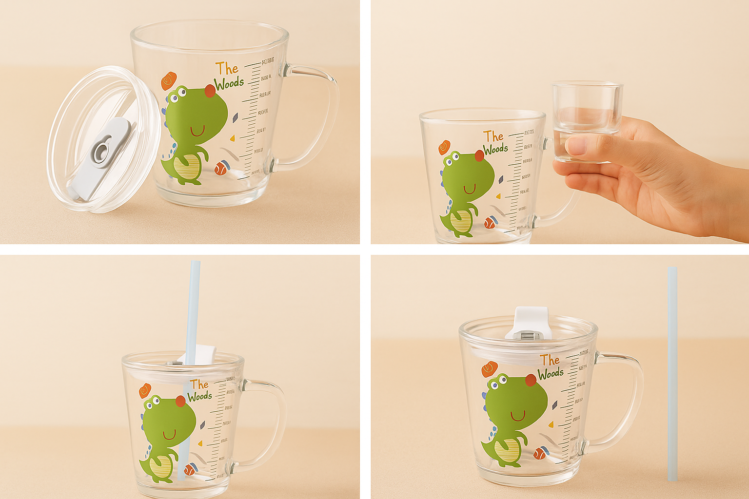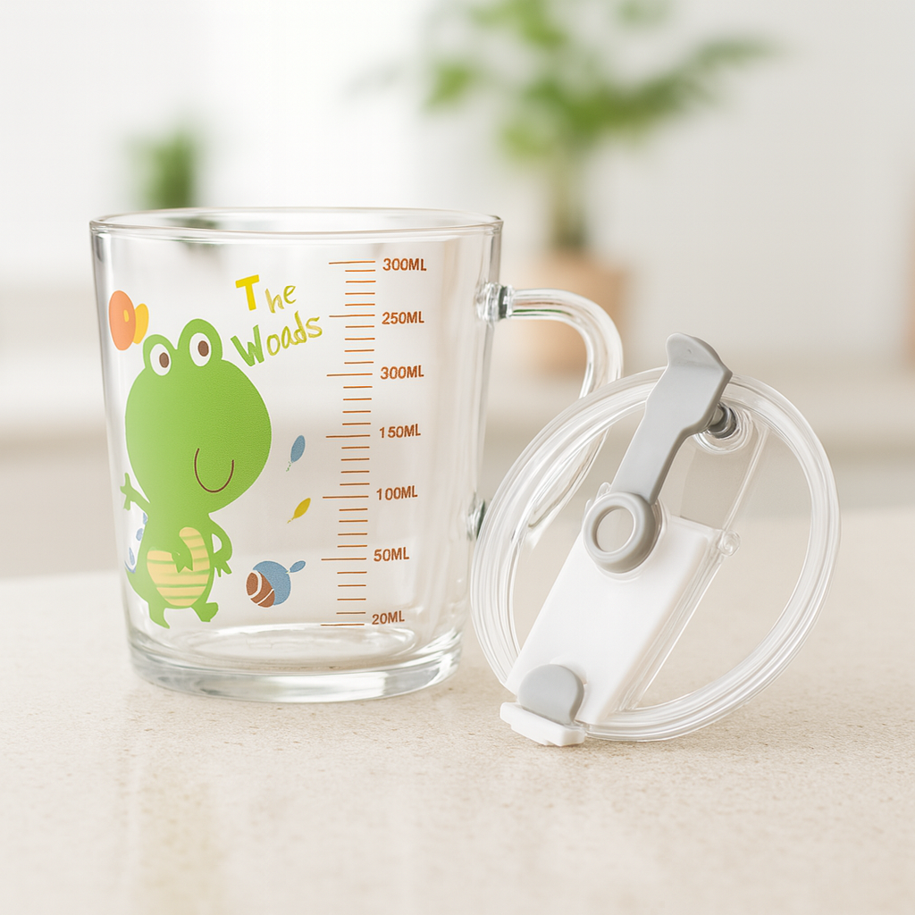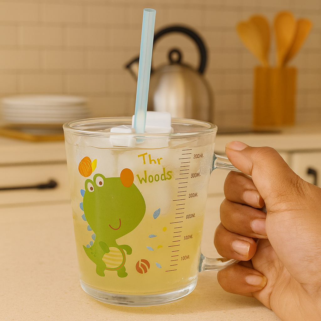 Make mealtime fun and safe with this adorable dinosaur-themed kids’ glass beaker. Designed with clear measurement markings up to 350ml, a sturdy handle, and a spill-proof lid with straw, it’s perfect for everyday use. The playful cartoon print encourages kids to enjoy their drinks while parents can rely on its safety and durability. Ideal for milk, juice, water, soups, and even cereals.