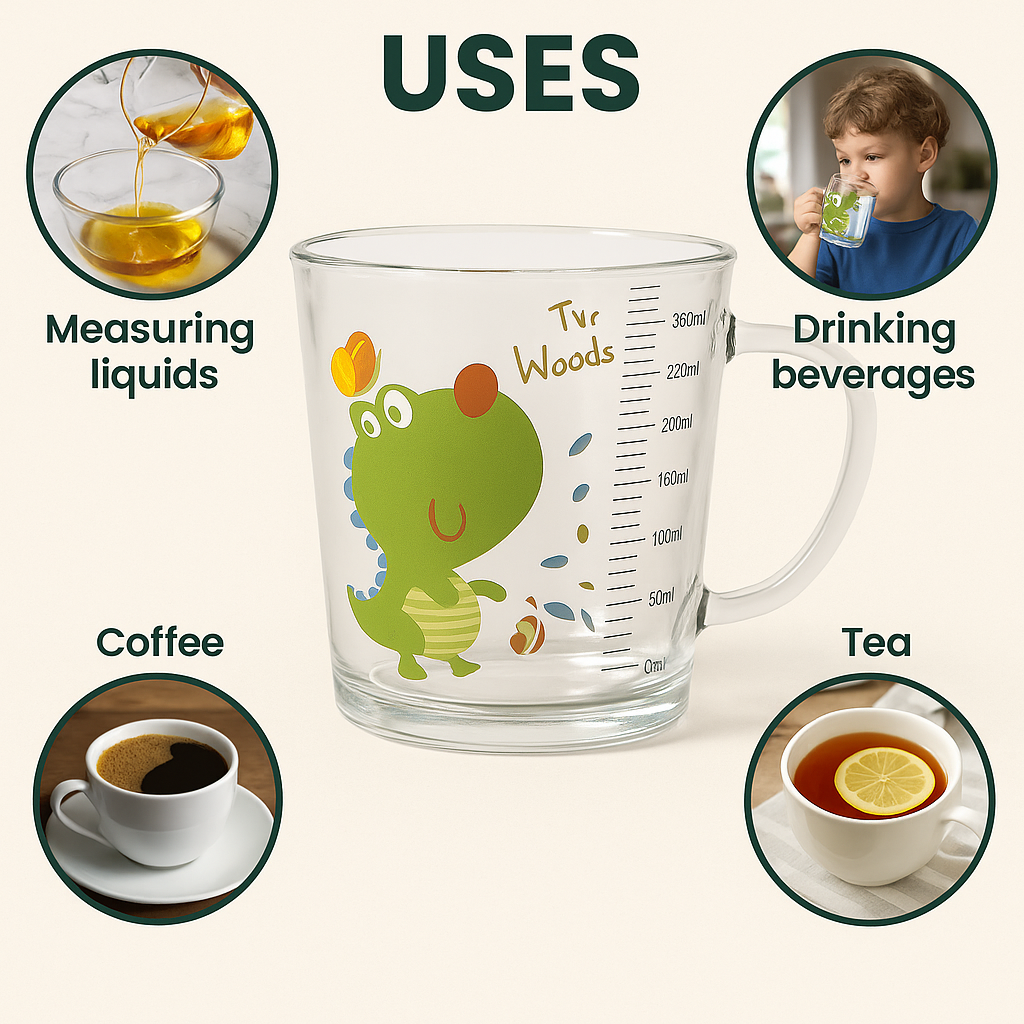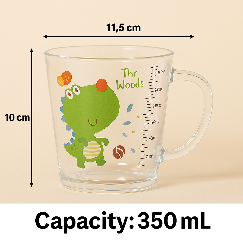 • Item: Cute Kids Glass Beaker with Handle & Measurement Scale – 350ml | Dinosaur Printed Mug with Lid & Straw | Ideal for Milk, Juice & Water