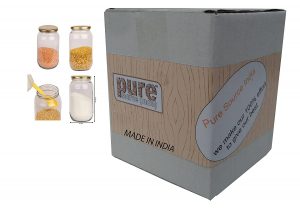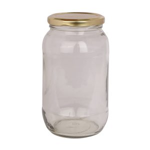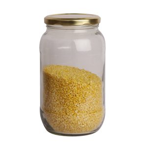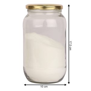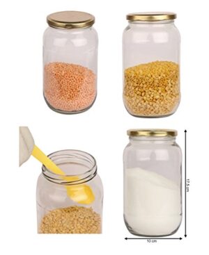 Glass jar container round shape set of 4 Glass jar , size is – 7 inch height and 3.75 inch dia ,which can contain about 1 LTR . this jar is coming with a good quality golden color metal cap which is air tight and special coating has been done inside of cap to avoid any type of problem in the item you store in the same , it’s completely rust proof and safe to store you food items .