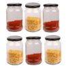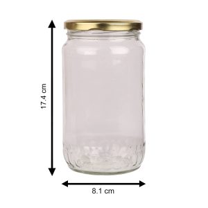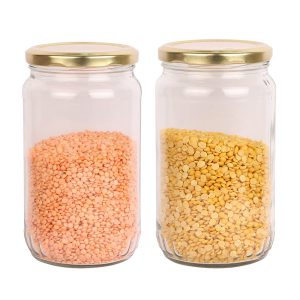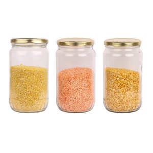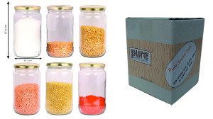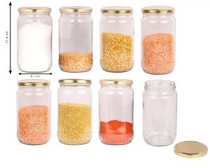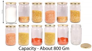Glass jar container round shape set of 12 glass jar, size is – 6.5-inch height and 3.6-inch dia, which can contain about 800 gm. This jar is coming with a good quality golden color metal cap which is airtight and the special coating has been done inside of the cap to avoid any type of problem in the item you store in the same, it’s completely rust proof and safe to store your food items.