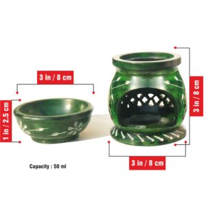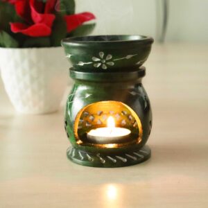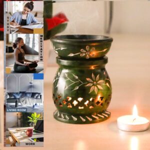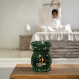 Pure Source India Handcrafted Leaf Design Soapstone Aroma Burner Oil Diffuser with 10ML Relaxing Oil & 2 Tea Light Candle (Green)