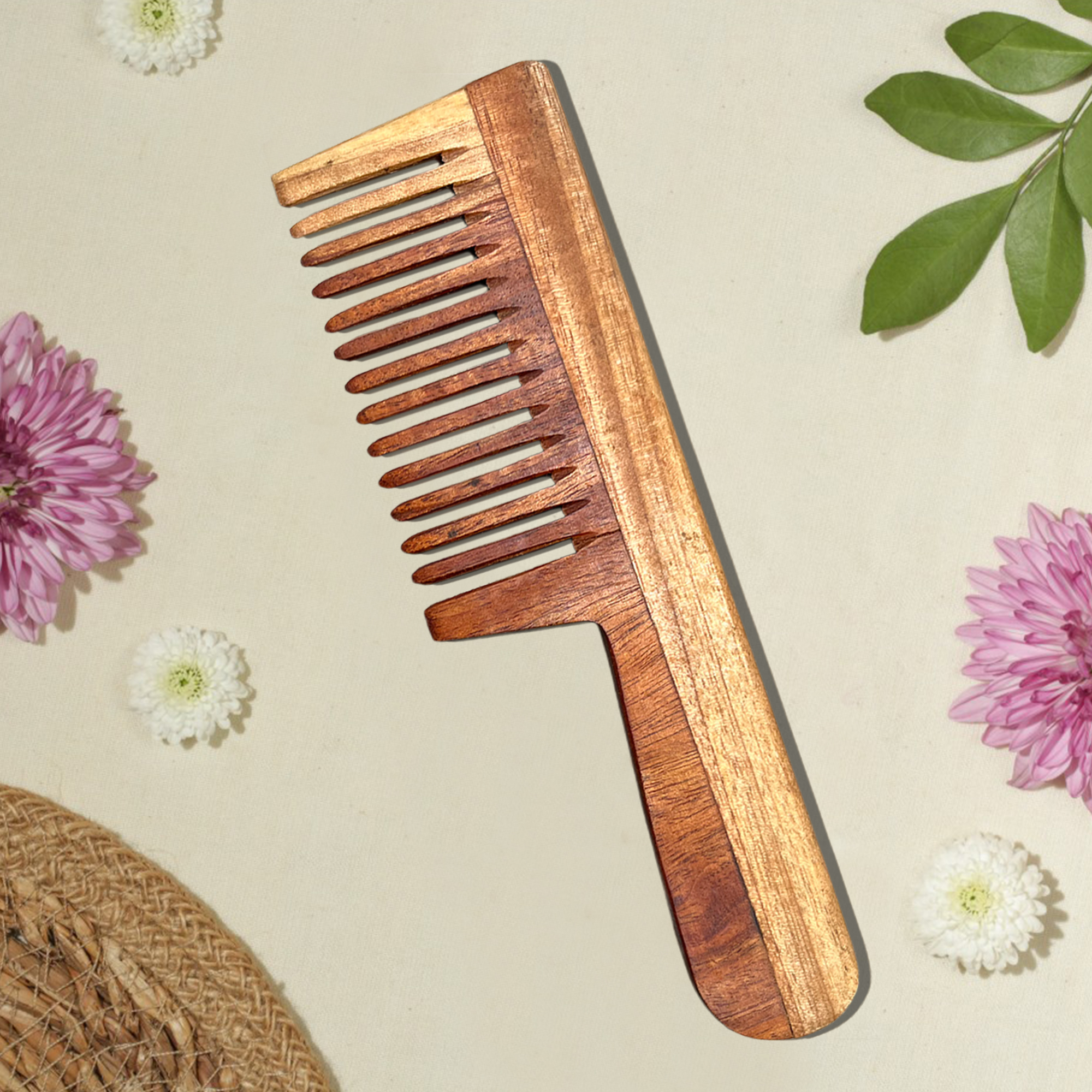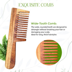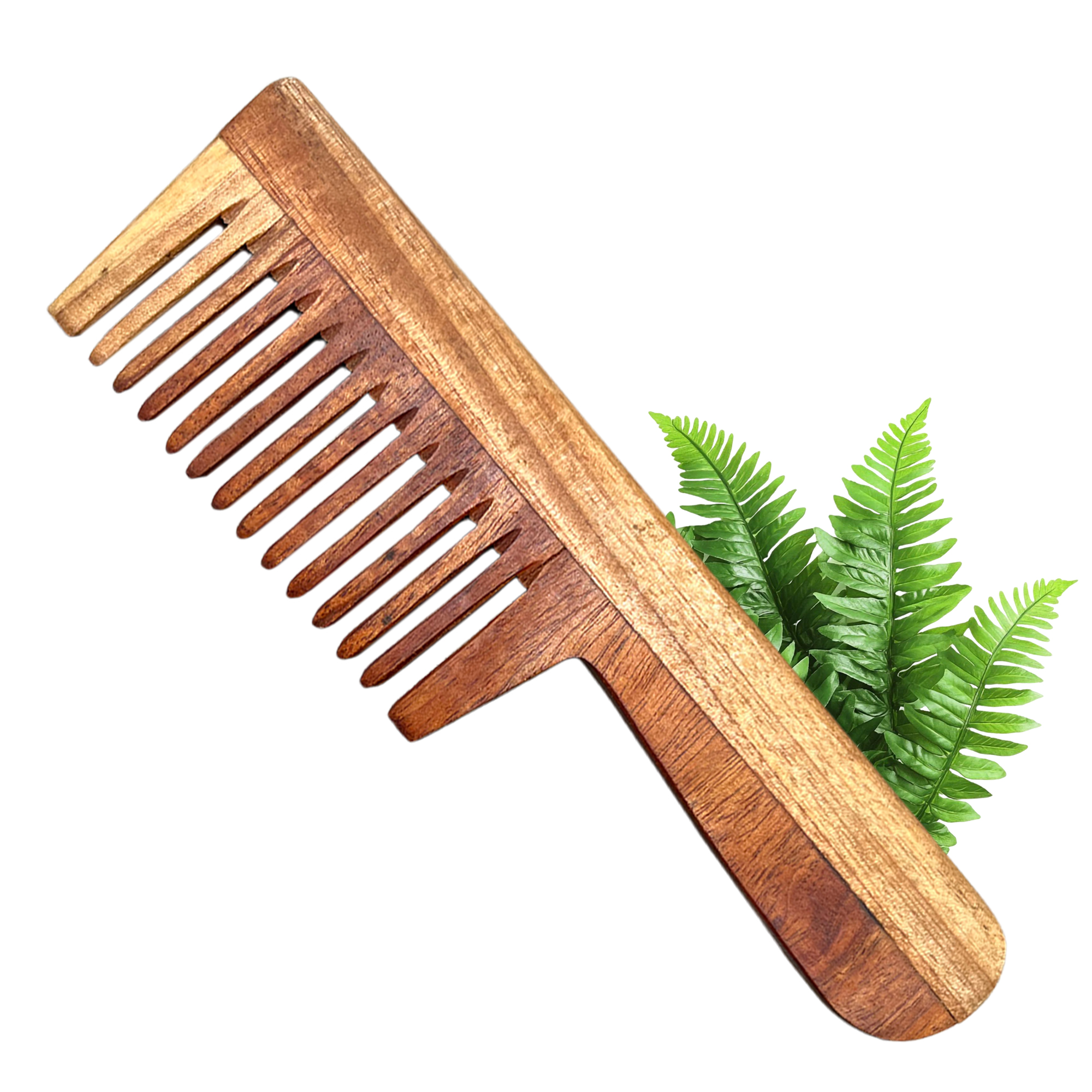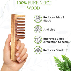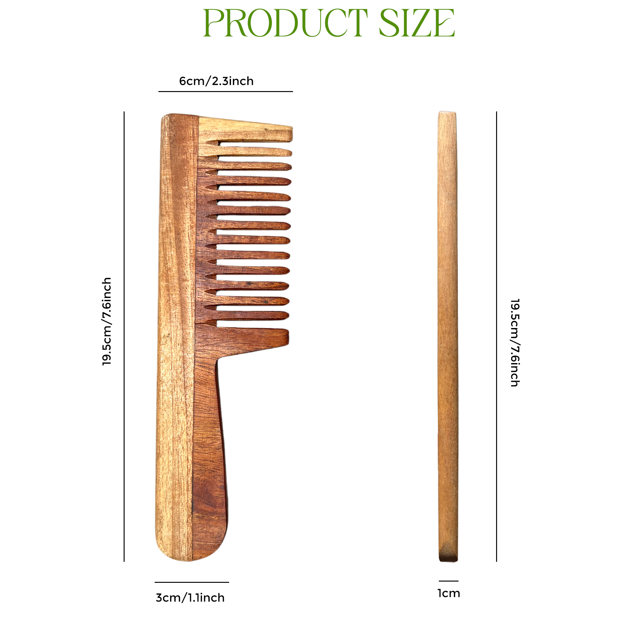 Nourish your hair naturally with our 100% Pure Neem Wood Comb. Handcrafted from Natural neem wood, this comb is a perfect eco-friendly solution for daily hair care. Known for its antibacterial and antifungal properties, neem helps reduce dandruff, prevent scalp infections, and promote healthy hair growth. The wide-tooth design gently detangles hair without breakage, while the smooth finish ensures a soothing scalp massage. Suitable for all hair types, including curly, thick, or frizzy hair, this wooden comb is an ideal addition to your natural grooming essentials.