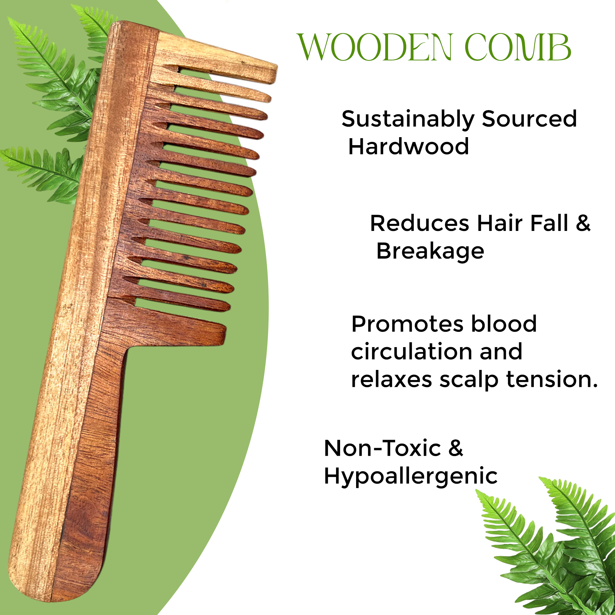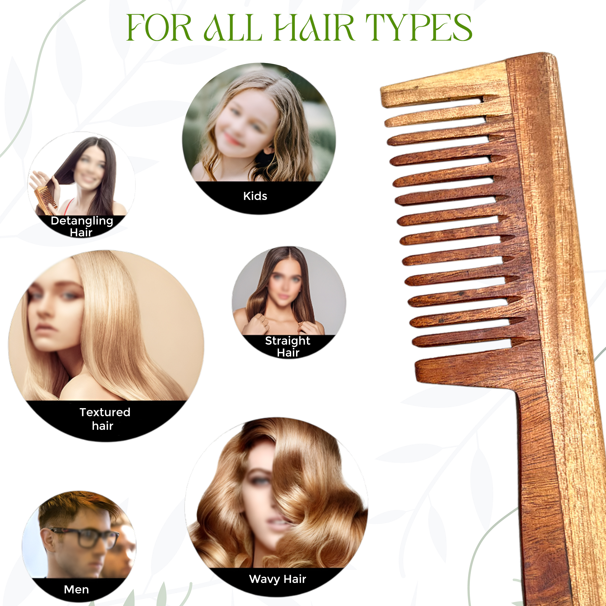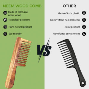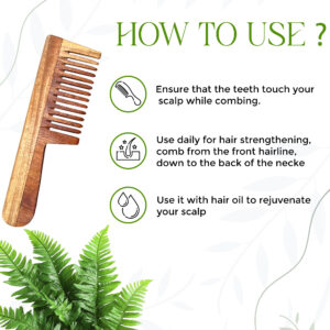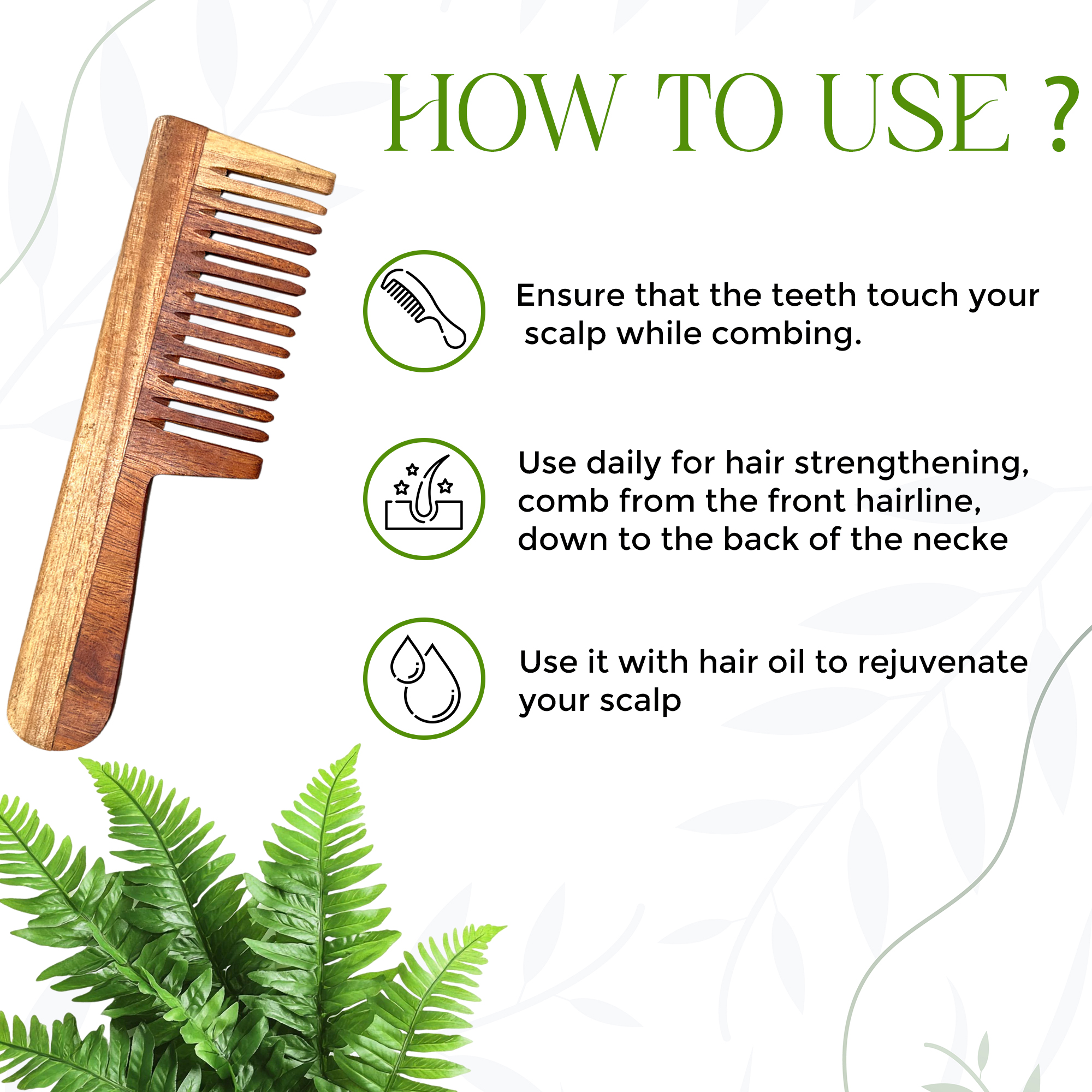 Nourish your hair naturally with our 100% Pure Neem Wood Comb. Handcrafted from Natural neem wood, this comb is a perfect eco-friendly solution for daily hair care. Known for its antibacterial and antifungal properties, neem helps reduce dandruff, prevent scalp infections, and promote healthy hair growth. The wide-tooth design gently detangles hair without breakage, while the smooth finish ensures a soothing scalp massage. Suitable for all hair types, including curly, thick, or frizzy hair, this wooden comb is an ideal addition to your natural grooming essentials.
