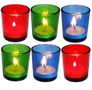 - The Package contains: 12 Glass Votive T-light holders, and 6 T light, ( 4 assorted color as in picture 3 pcs each)