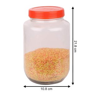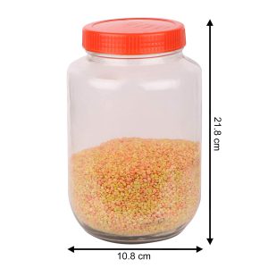 Glass jar container round shape , size is – 9-inch about height and 6 inch about dia ,which can contain about More than 2 KG Of any kitchen related items like sugar, pulse , tea leafs. this jar is coming with a cap which is air tight and rust proof to avoid any type of problem in the item you store in the same , it’s completely rust proof and safe to store you food items .