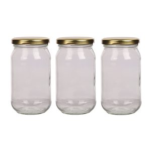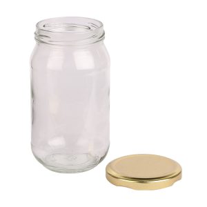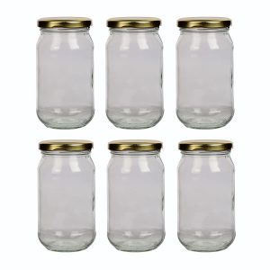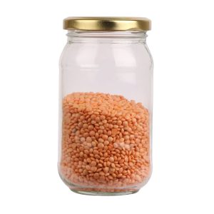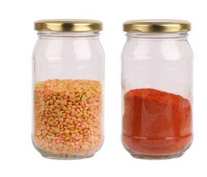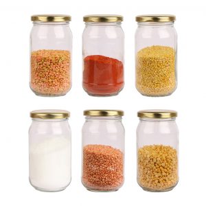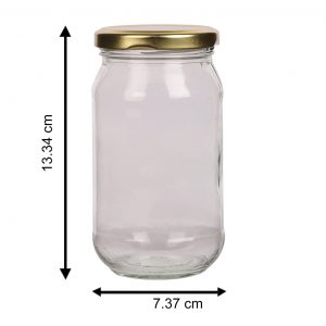 Glass jar container round shape set of 6 Glass jam jar , size is – 5.25 inch height and 2.9 inch dia ,which can contain approx 300 Grams . this jar is coming with a good quality golden color metal cap which is air tight and special coating has been done inside of cap to avoid any type of problem in the item you store in the same , it’s completely rust proof and safe to store you food items .