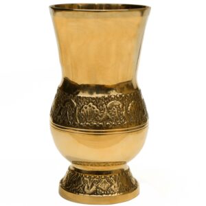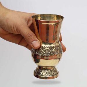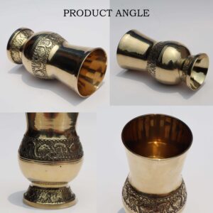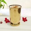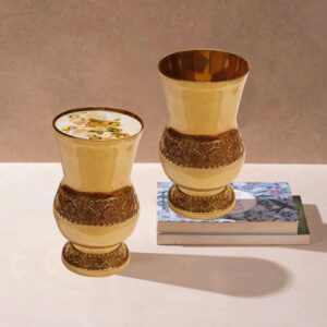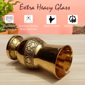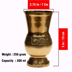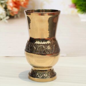 This pure brass tumbler is a beautifully crafted drinking glass with a timeless, elegant design. Made from 100% brass, it holds up to 300ml of liquid and is ideal for serving water, juices, or traditional drinks like buttermilk or lassi. Its polished golden surface not only enhances your table setting but also brings the health benefits associated with drinking from brass. This tumbler combines traditional craftsmanship with everyday utility, making it a perfect addition to your kitchen or a thoughtful gift.