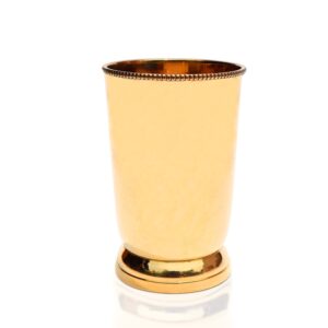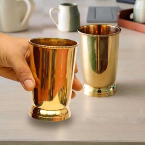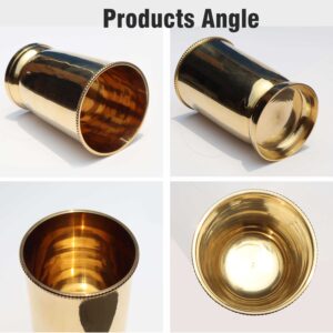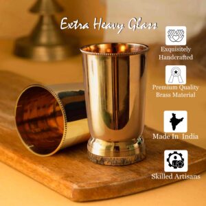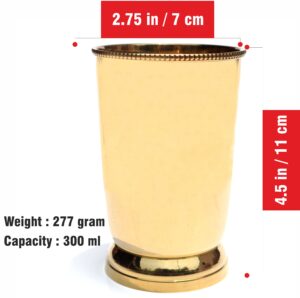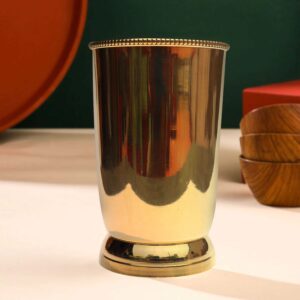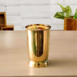 This pure brass tumbler is a beautifully crafted drinking glass with a timeless, elegant design. Made from 100% brass, it holds up to 300ml of liquid and is ideal for serving water, juices, or traditional drinks like buttermilk or lassi. Its polished golden surface not only enhances your table setting but also brings the health benefits associated with drinking from brass. This tumbler combines traditional craftsmanship with everyday utility, making it a perfect addition to your kitchen or a thoughtful gift.