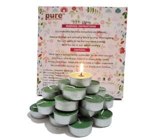 Pure Source India smokeless tea light candle ,Package of 25 Scented Tealight candles in a self-standing aluminum tin. With these quality Tealights you can enjoy the warm glow of a fine candle while enjoying the maximum safety of the tea light candle. If you€re a restaurant, party planner or just enjoy dining to the romantic touch of tealites, these quality long burning will deliver the ultimate and lasting radiation of warmth. made with a special technique to prevent early burn out of your Tea Lights. Tea Lights are an efficient and inexpensive, cost effective form of candle lighting for your ritual and religious ceremonies or any type of celebrations and Holidays. Universal size of ½€ tall x 1.5€ diameter. Burns nice and clean to the last drop for 2.5 / 3 hours. \”WARNING\” Never leave burning candle unattended. Keep 2 inches between candles. Put candles on fireproof objects only.